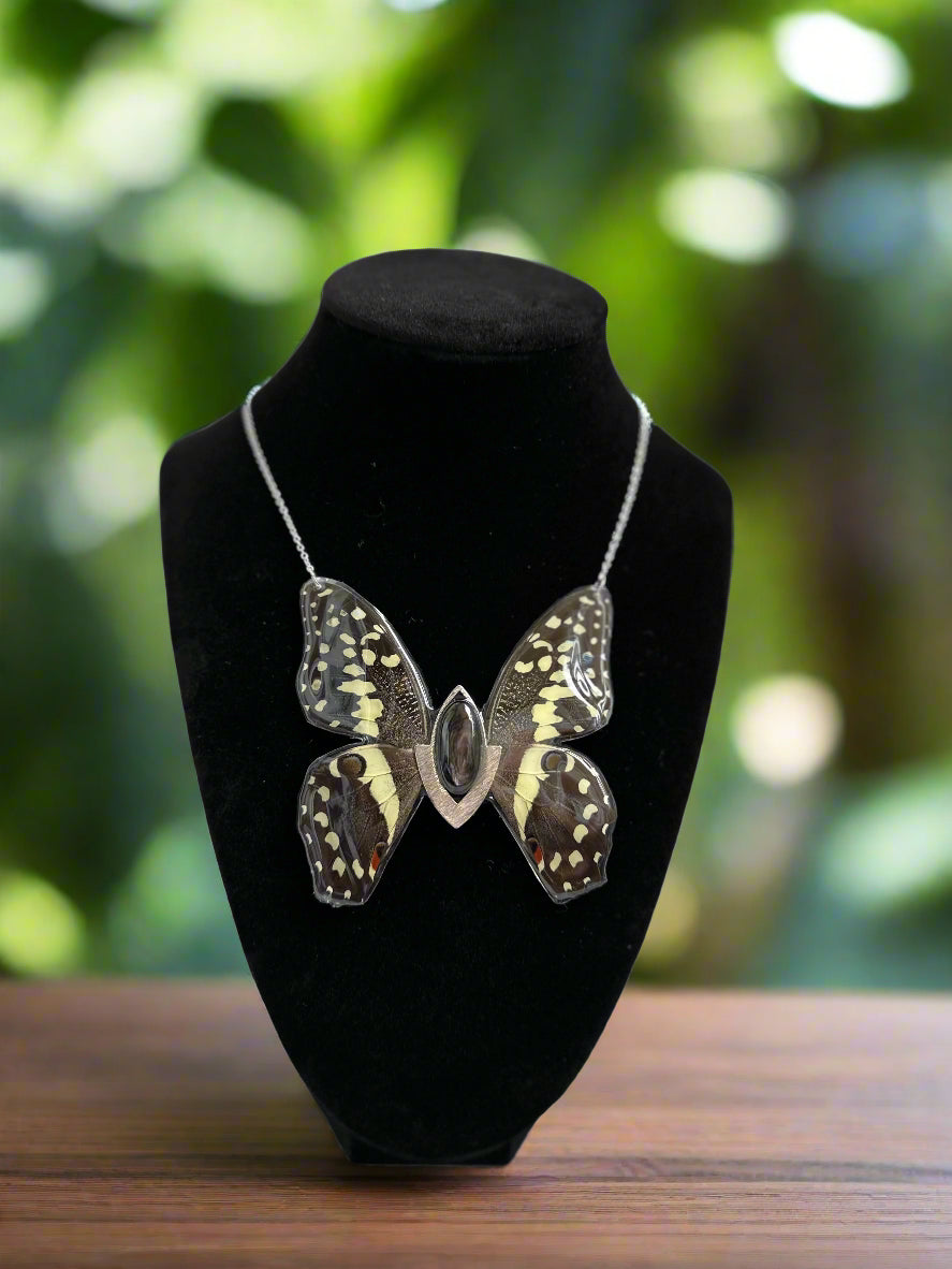 This amulet was created with the intention to promote a sense of power, confidence, and grounding for it's wearer. Citrus swallowtail(papilio demodocus) are native to Arabia and Africa. Living only 3-6 days they embody the energy of death and rebirth. Ethically sourced